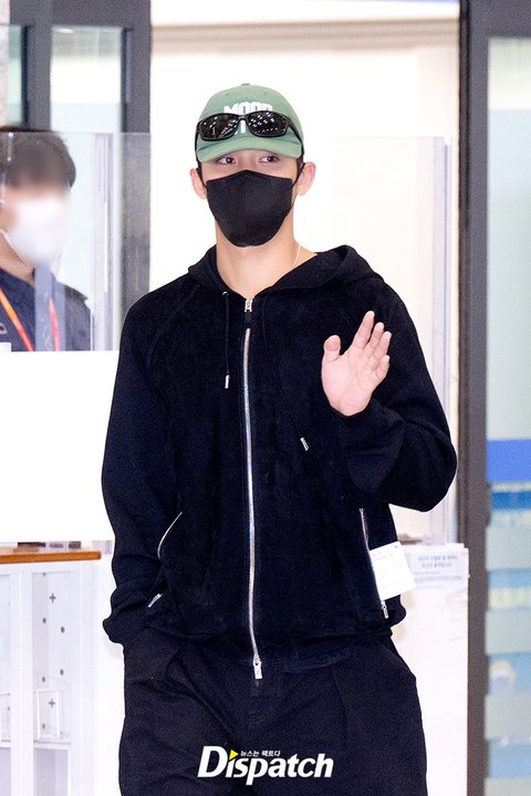 민규는 블랙 트레이닝룩으로 수수한 공항패션을 연출했다. 우월한 비율이 돋보였다.