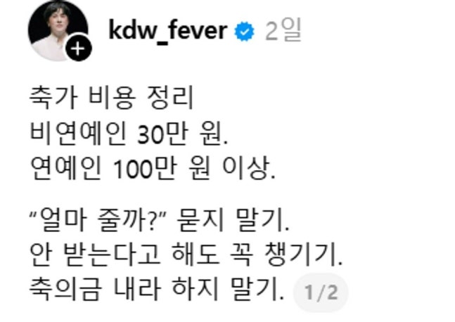 그룹 신화 멤버 출신 배우 김동완이 연예인 축가 비용에 대한 자신의 의견을 밝혔다.김동완은 최근 자신의 SNS(소셜미디어) 계정에 "축가 비용 정리"라는 글을 올렸다.