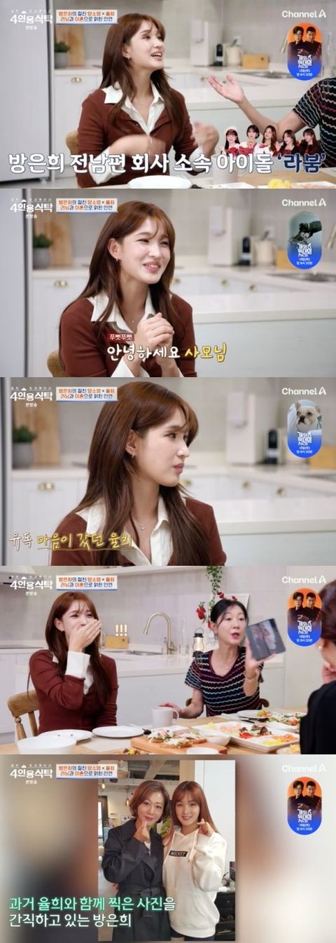 29일 방송된 채널A ‘절친 토큐멘터리-4인용식탁’(이하 4인용식탁)에는 배우 방은희가 출연해 절친으로 전 남편의 회사 소속 걸그룹 ‘라붐’의 멤버였던 율희, 그리고 현재 율희의 양육권 소송을 담당하고 있는 양소영 변호사를 초대해 이야기를 나누었다.