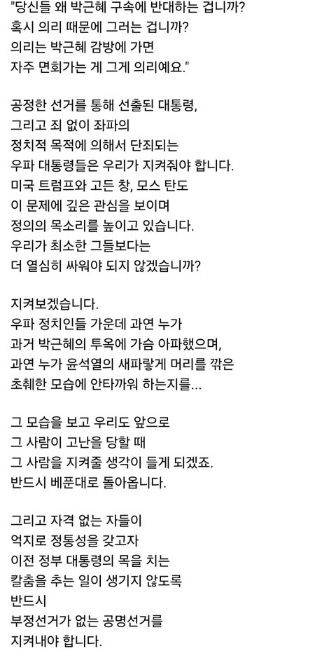 이런 글 속 터진다. 국민들이 바보냐? 죄 없는 전직 대통령을 감방에 처 넣는걸 보고만 있게. 이런 카더라 글 만들 머리로 국가 발전 방향이나 모색해 보렴. 참, 밥은 제때 먹고 사니?