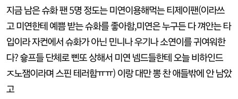 지금 남은 슈화 팬 5명 정도는 미연이용해먹는 티제이팬(이라쓰고 미연한테 예쁨 받는 슈화를 좋아함,미연은 누구든 다 껴안는 타입이라 자컨에서 슈화가 아닌 민니나 우기나 소연이를 귀여워한다? 슣프들 단체로 삔또 상해서 미연 넴드들한테 오늘 비하인드 ㅈ노잼이라며 스핀 테러함ㅠㅠ) 이랑 대만 뽕 찬 애들밖에 안 남았고