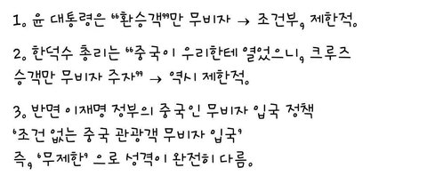 윤통이 추진한건 환승 입국임. 제 3국 여행이 확정된, 신분이 확실한, 여행객을 체류 할 수 있게 해주는 제한적 무비자 입국. 근데 지금부터 들어오는 중국인 관광객 무비자 입국은 어떤 제한이 있음? 관리하는 곳이 불타서 사본으로도 한다는데 이게 말이 되냐? 복구가 다 된 다음 그때 무비자 해도 되는데 왜 복구도 안된 상태에서 받아들여? 불법체류 하면 너가 잡을거야?