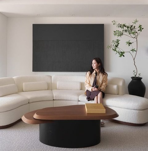 사진 속 효민은 큰 소파를 거실에 둔 채 앉아있다. 효민은 동양적 느낌으로 거실을 꾸며 남다른 감각을 보여준다. 효민은 만족스러운 미소를 짓고 있다.