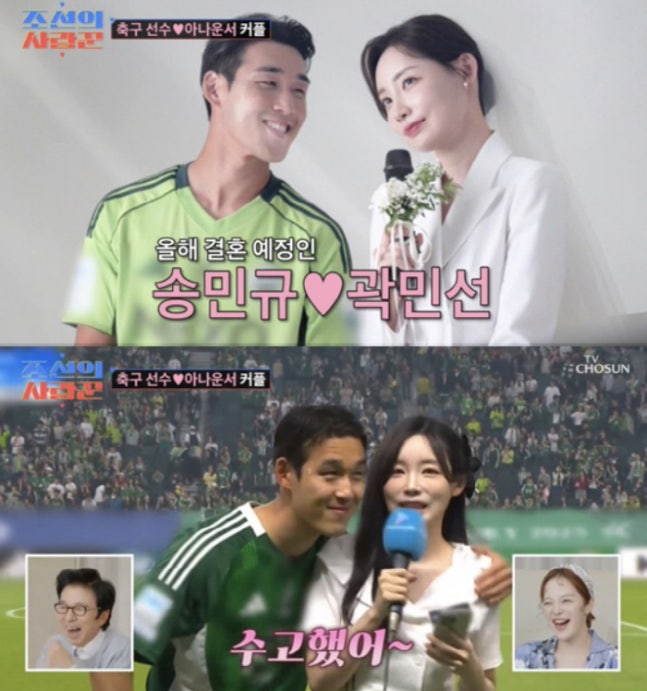현재 전북 현대 모터스 소속인 송민규는 2023년 항저우 아시안게임 남자 축구 대표팀에 소속돼 금메달의 영광을 안았다. 그리고 송민규의 '예비 신부' 곽민선은 스포츠와 e스포츠 분야에서 팔방미인 아나운서로 활동 중이다.두 사람의 첫 만남은 송민규의 DM으로 시작됐다고. 곽민선은 "민규씨가 당시 21살이어서 너무 어리기도 했고 편하게 동생처럼 생각했다. 근데 사석에서 만나니까 생각보다 스윗하더라"고 전했다.