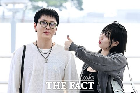 가수 현아(오른쪽)와 용준형 부부가 30일 오후 해외 일정 참석 차 인천국제공항을 통해 싱가포르로 출국하며 포즈를 취하고 있다.