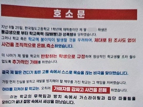 피해자 학생이 2차가해(학교측 사건 은폐,축소)로 스스로 목숨 끊었어