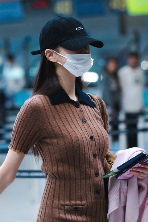 공항에서 찍힌 니트 원피스 입은 워녕이