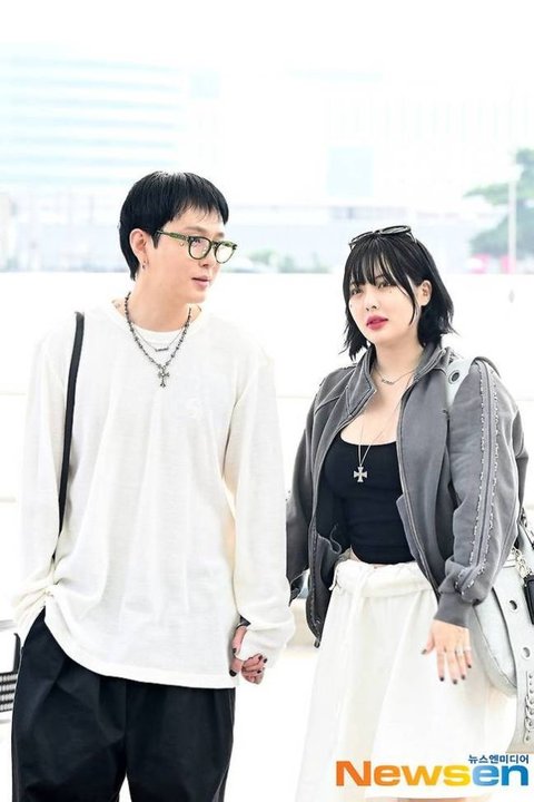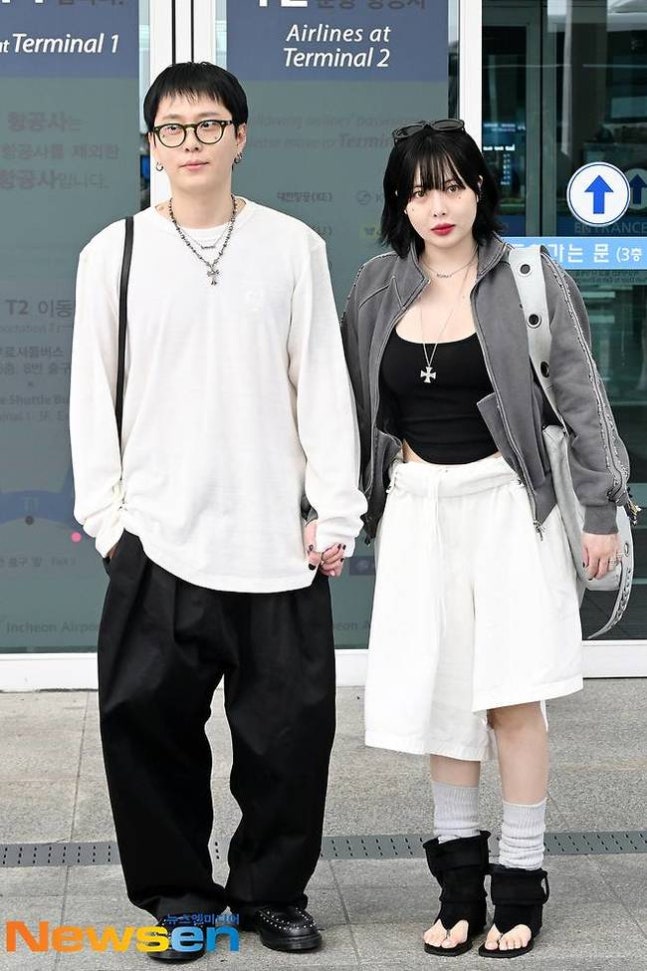 이날 현아는 블랙 크롭탑에 그레이 후드 집업 재킷, 화이트 팬츠를 매치한 힙한 스타일을 선보였다. 용준형 역시 화이트 티셔츠에 블랙 와이드 팬츠를 매치한 스트릿룩으로 세련된 감각을 뽐냈다. 두 사람은 손을 꼭 잡고 등장해 다정한 분위기를 자아냈다.