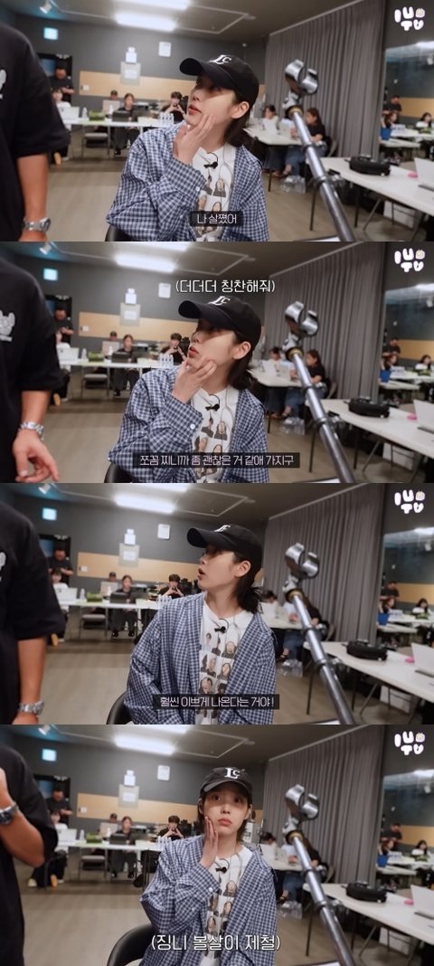 아이유는 “조금 찌니까 괜찮은 거 같아서. 촬영하다가 조금 쪘는데 훨씬 예쁘게 나온다는 거다”라고 흡족해했다. 이어 자신의 볼을 만지며 부쩍 붙은 볼살을 보여주기도 했다.