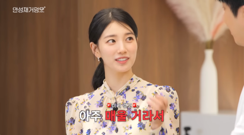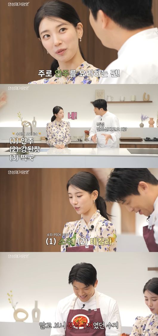 이날 수지는 “평소에 안주를 많이 해 먹는 편이다. 술을 좋아해서”라며 “한식도 하고 강된장, 떡국 등 직접 만든다”라고 요리 실력을 자랑했다. 안성재가 “나름 되게 실력이 있으신?”이라고 놀라자 수지는 “근데 저는 시판 소스를 쓴다. 그래서 좀 추가를 하기도 하고”라고 솔직하게 털어놨다.
