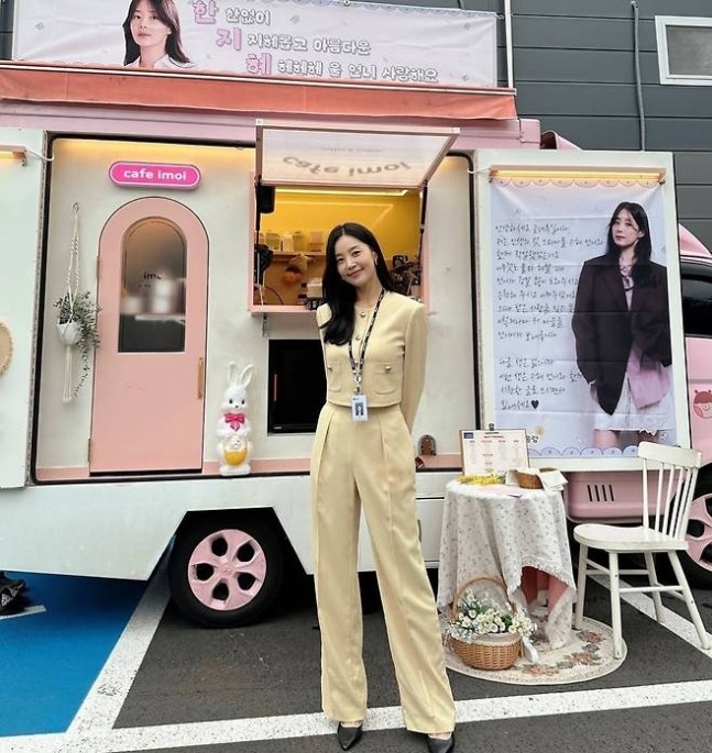 공개된 사진 속 그는 연한 옐로우 컬러의 크롭 재킷과 하이웨스트 팬츠를 매치해 단정하면서도 세련된 분위기를 자아냈다. 잘록한 허리를 강조하는 크롭 실루엣은 그의 우월한 8등신 비율을 한층 돋보이게 했다.