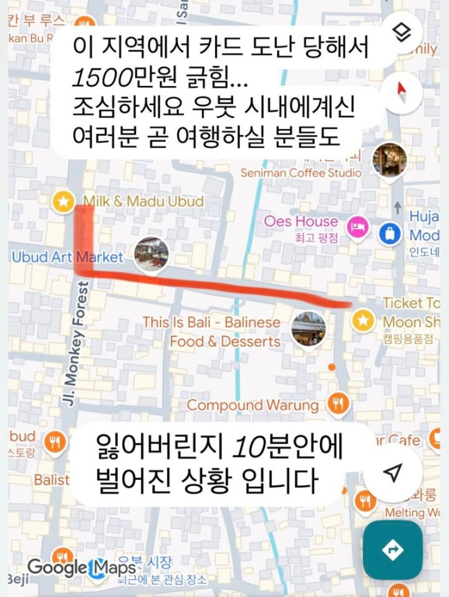 전혜빈은 1일 자신의 SNS에 “이 지역에서 카드 도난당해서 1500만 원 긁힘”이라며 피해 사실을 알렸다. 함께 올린 게시물에는 발리 우붓 지역의 지도 캡처 사진이 담겼다.