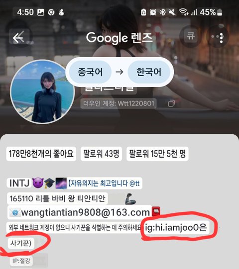 실상은 중국의 인플루언서를 도용한 사칭범이다.