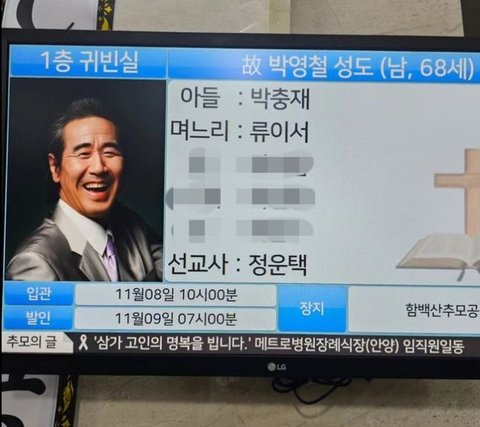 전진은 과거 찰리박과 절연한 것으로 전해졌지만 아내 류이서와 함께 상주로 빈소를 지키며 조문객을 맞았다. 그런데 무가당 출신 가수 프라임이 자신의 SNS에 공개한 빈소 사진에 따르면 상주에 익숙한 이름이 한 명 더 있었다. 바로 배우 정운택. 그는 선교사 정운택으로 상주의 역할을 했다.