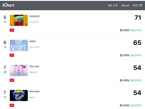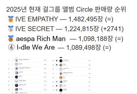 블랙핑크, 르세라핌, 트와이스, 아일릿, 뉴진스, 베이비몬스터, 베몬, 미야오, 장원영, 카리나