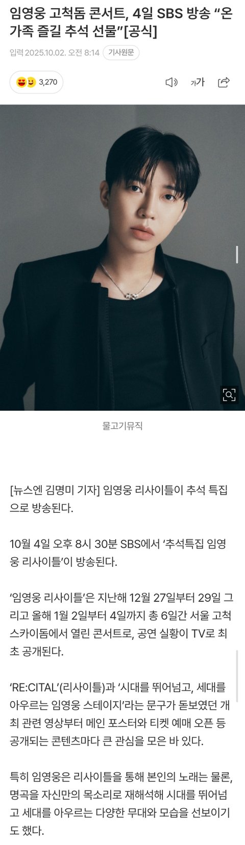 리사이틀 컨섭으로 작년 연말에 했던 콘서트 방송해주나본데 임영웅이 기존에 하던 전국투어는 본인 앨범. 신곡으로하는 거였다면 리사이틀은 본인곡외에 흘러간 명곡들 임영웅 재해석해서 리메이크콘서트처럼 한거여서 가족끼리 추석에 보기엔 더 좋을듯 아는 노래들. 흘러간 가요들 많이 나와서