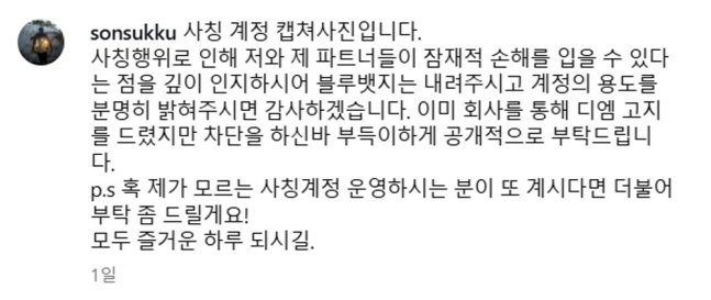 배우 손석구가 지난 9월 18일 자신의 개인 계정에 본인을 사칭한 계정 캡처본을 업로드했다. 그는 "사칭 행위로 인해 저와 제 파트너들이 잠재적 손해를 입을 수 있다는 점을 깊이 인지해달라"며 "블루 배지를 내려주고 계정의 용도를 분명히 밝혀주시면 감사하겠다"고 강조했다. 그러면서 "이미 회사를 통해 메시지로 고지를 드렸지만 차단해 부득이하게 공개적으로 부탁한다"며 "혹시 제가 모르는 사칭 계정 운영자가 있다면 부탁한다"고 썼다.