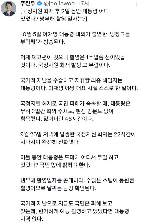 다 떠나서 반대로 보수 정부에서 같은 상황에 예능 녹화 따고 있었다고 생각해 봐라 민주당에서 바로 선동에 뭐 박근혜 떄처럼 몇시간 진실을 밝히니 하면서 또 탄핵 몰이 안 했겠냐 국힘이 좋고 민주당이 좋고 떠나 세월호 이태원 때 생각하면 해도 너무 심한 내로 남불 아님?? 문재인 코로나 사망자 나왔을 때 짜잠자리 처먹은 것도 그렇고 지들이 하면 다 괜찮고 지들 정부 떄는 다 다른 데로 탓 돌리고 숨기기 급하고 상대 정부는 어떻게든 책임 걸고 넘어지고 선동하고 진짜 민주당이 대한민국을 위한 공당이 맞는거임??
