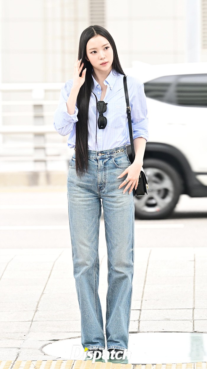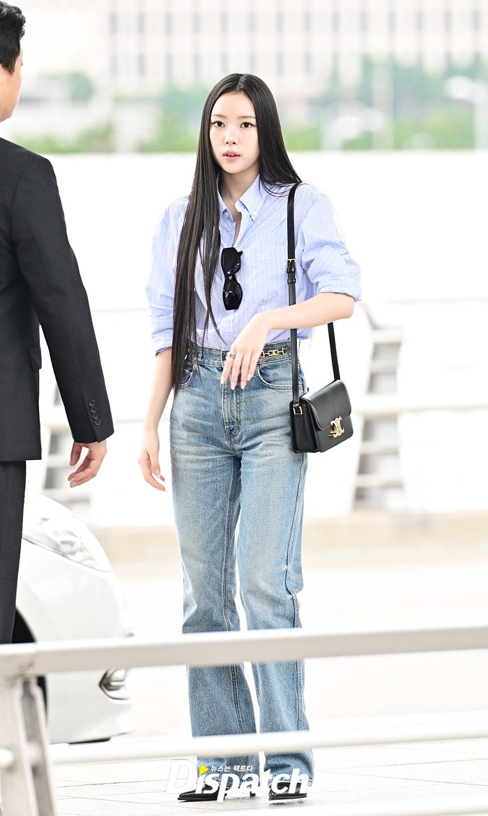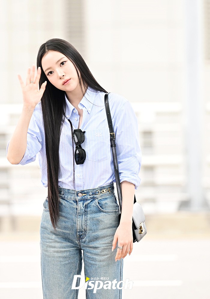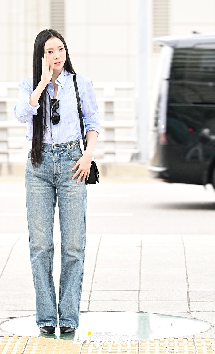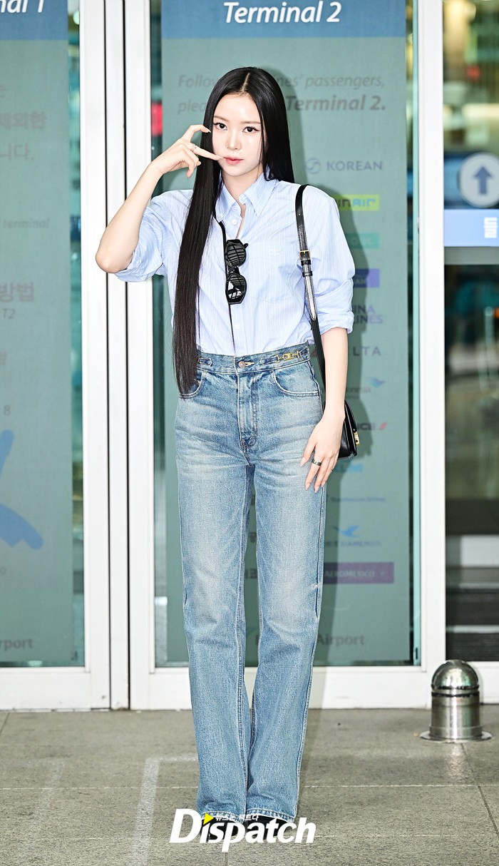 나린은 블루 컬러의 셔츠와 데님진으로 캐주얼한 공항패션을 연출했다. 청순한 비주얼과 러블리한 미소도 돋보였다.