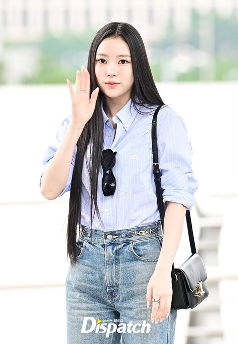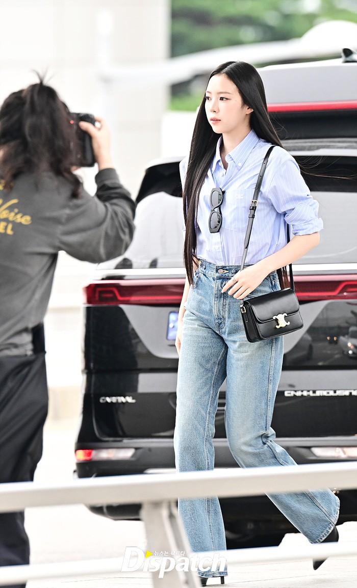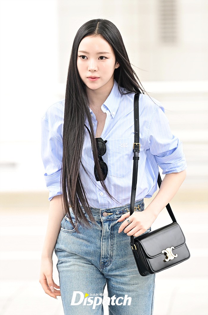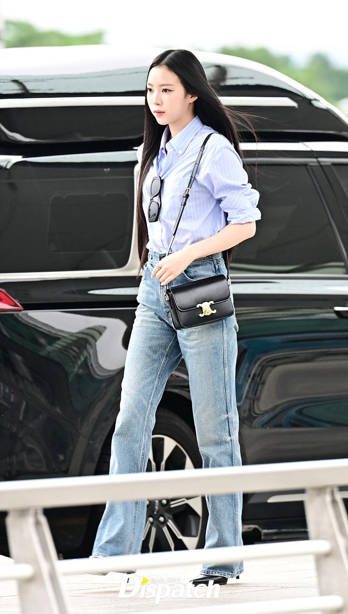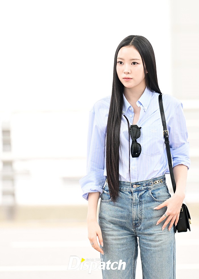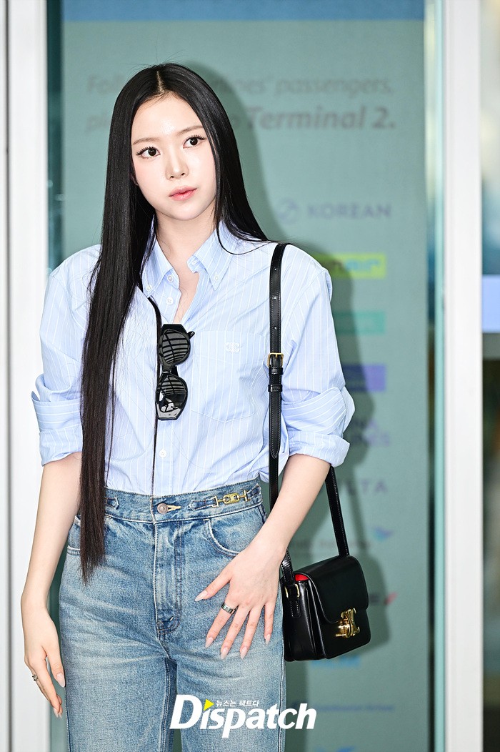 나린은 블루 컬러의 셔츠와 데님진으로 캐주얼한 공항패션을 연출했다. 청순한 비주얼과 러블리한 미소도 돋보였다.