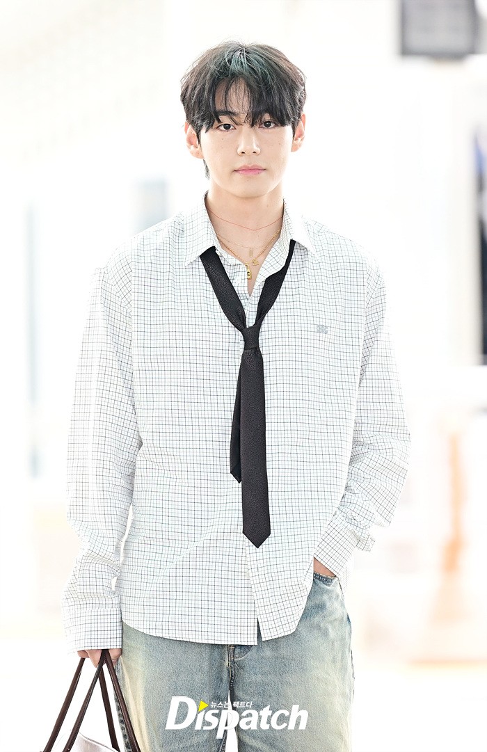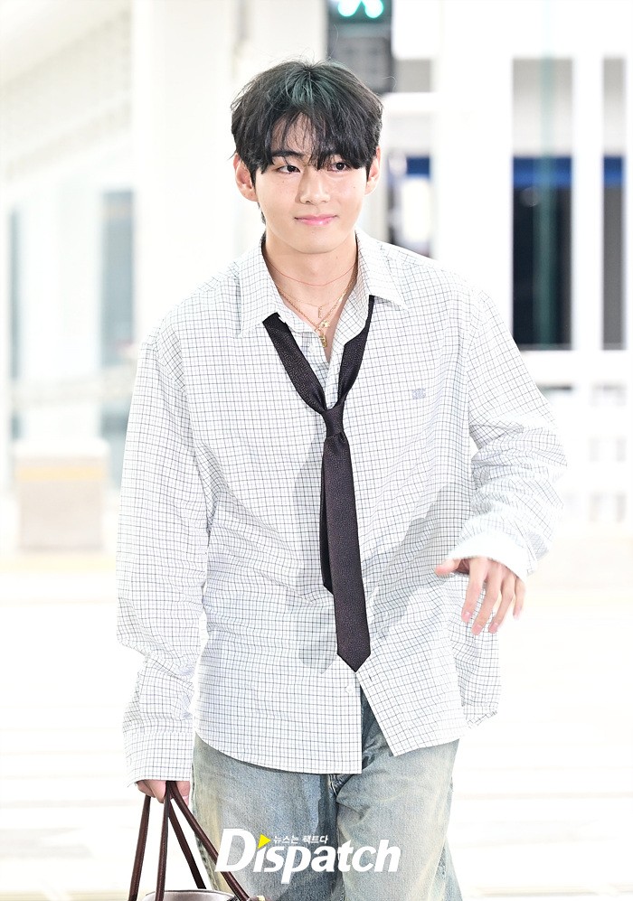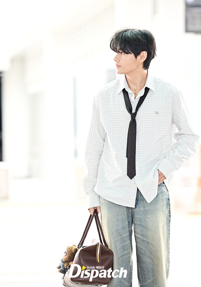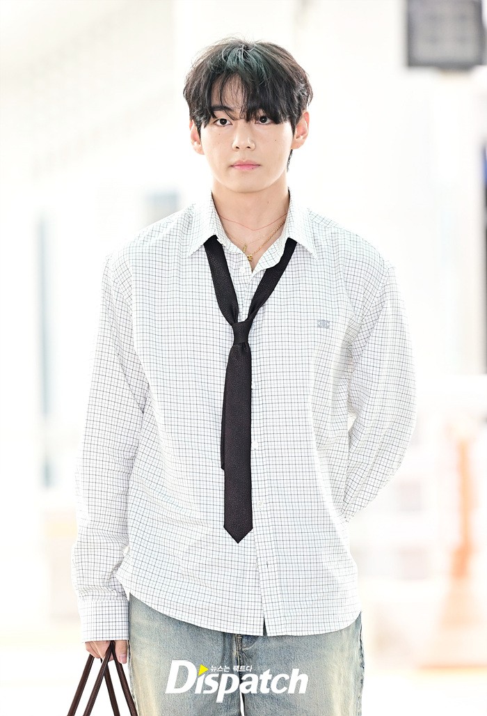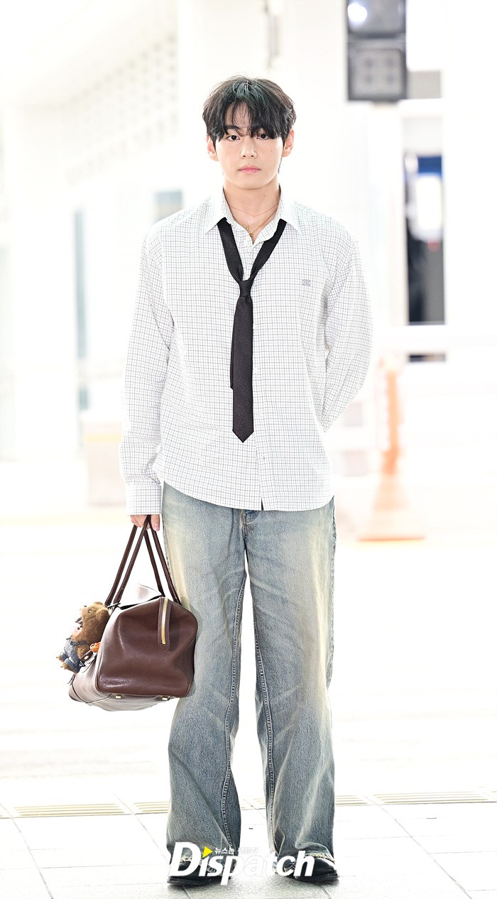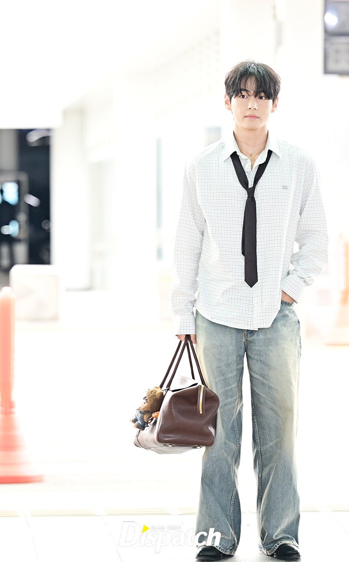 뷔는 오버핏 셔츠와 타이, 데님 와이드진으로 세련된 공항패션을 연출했다. 조각같은 비주얼과 스윗한 미소도 돋보였다.
