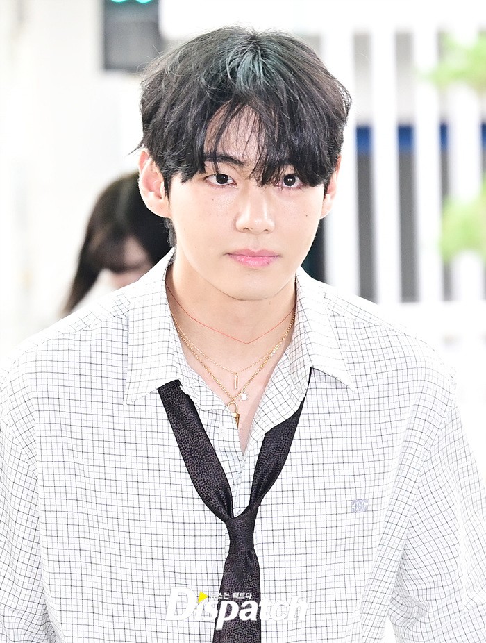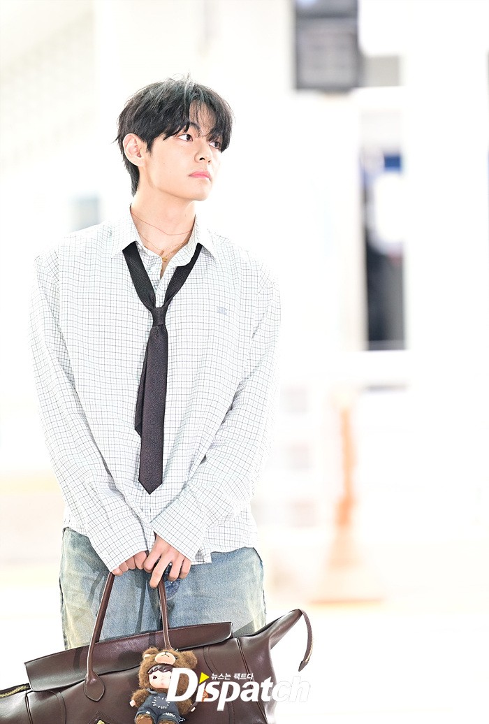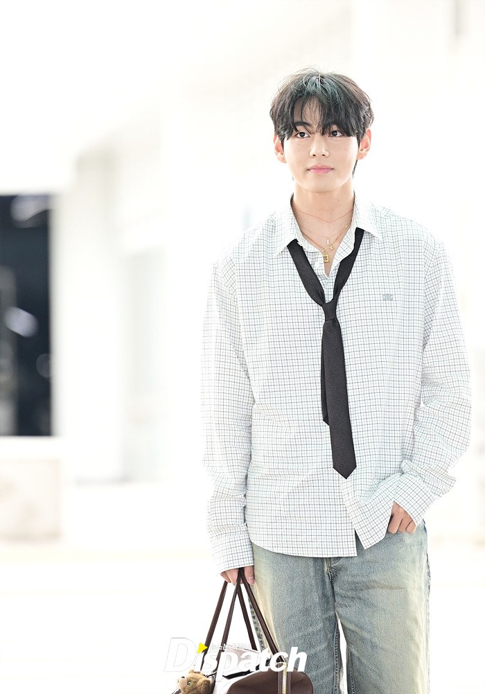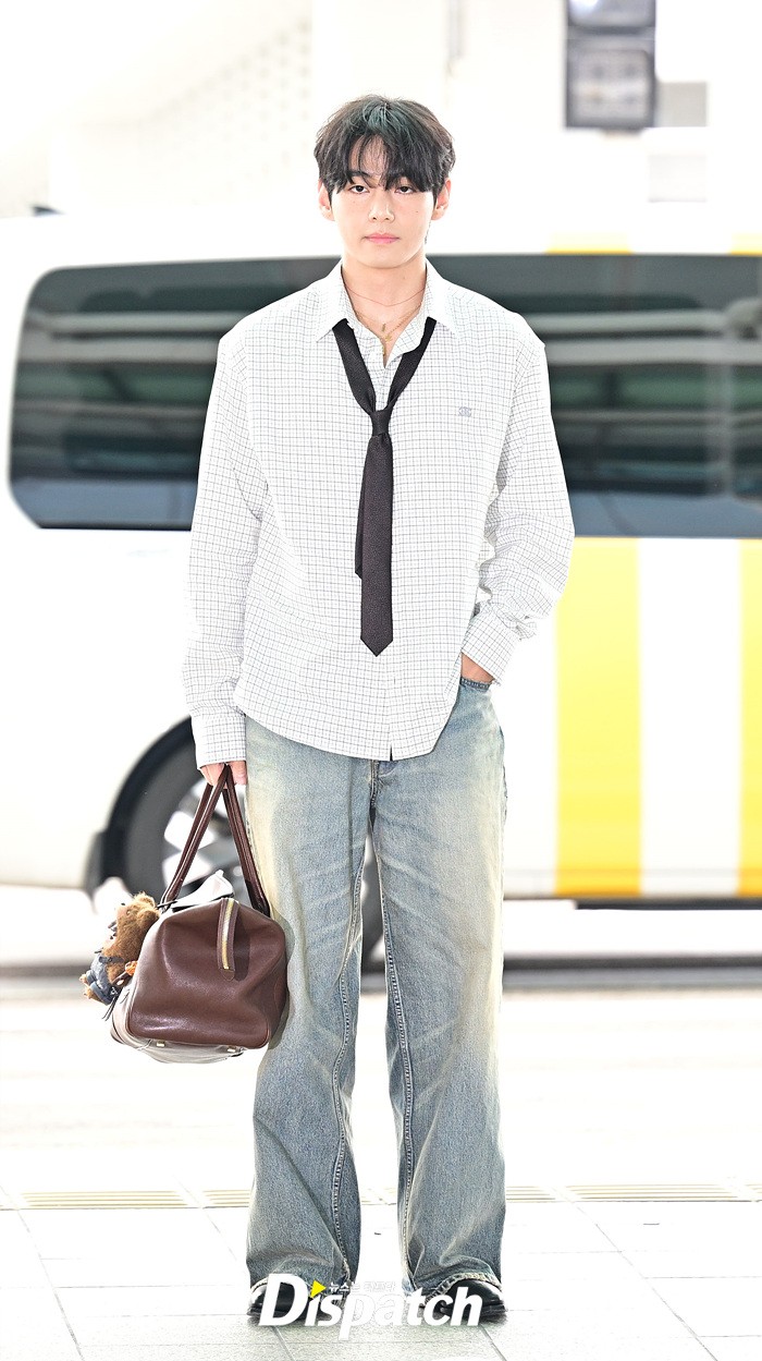 뷔는 오버핏 셔츠와 타이, 데님 와이드진으로 세련된 공항패션을 연출했다. 조각같은 비주얼과 스윗한 미소도 돋보였다.