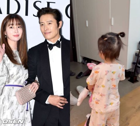 공개된 사진 속에는 머리를 양갈래로 묶은 이민정의 딸이 현관 앞에서 "아빠"라고 외치며 이병헌을 부르고 있는 모습이 담겨있다. 뒷모습만으로도 귀여운 이병헌 이민정 부부의 딸의 모습이 눈길을 끈다.
