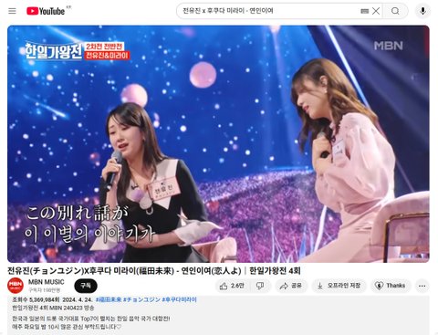 (사진7·8 설명) 전유진(チョンユジン)X후쿠다 미라이(福田未来) - 연인이여(恋人よ)|한일가왕전 4회