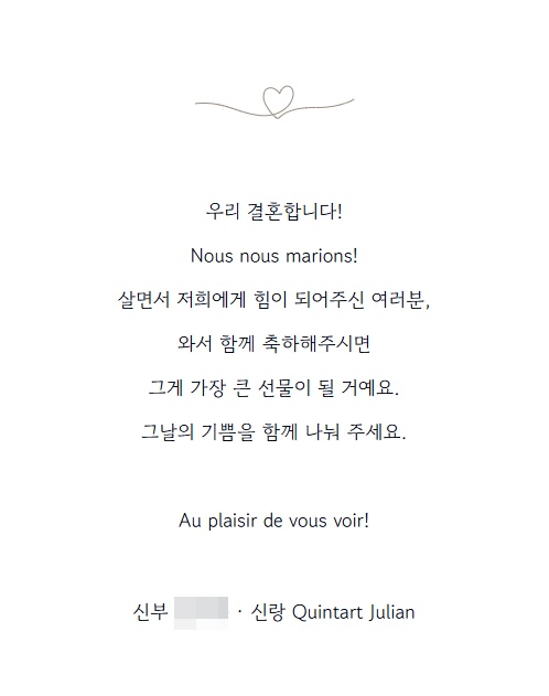 두 사람은 청첩장을 통해 "우리 결혼합니다! 살면서 저희에게 힘이 되어주신 여러분, 와서 함께 축하해주시면 그게 가장 큰 선물이 될 거예요. 그날의 기쁨을 함께 나눠주세요"라는 메시지를 전했다.