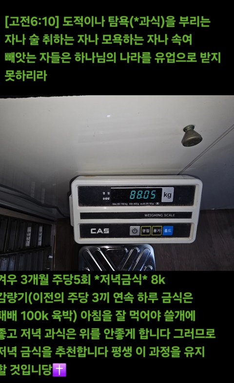 겨우 3개월 주당5회 *저녁금식* 8k 감량기(이전의 주당 3끼 연속 하루 금식은 패배 100k 육박) 아침을 잘 먹어야 쓸개에 좋고 저녁 과식은 위를 안좋게 합니다 그러므로 저녁 금식을 추천합니다 평생 이 과정을 유지 할 것입니당✝️