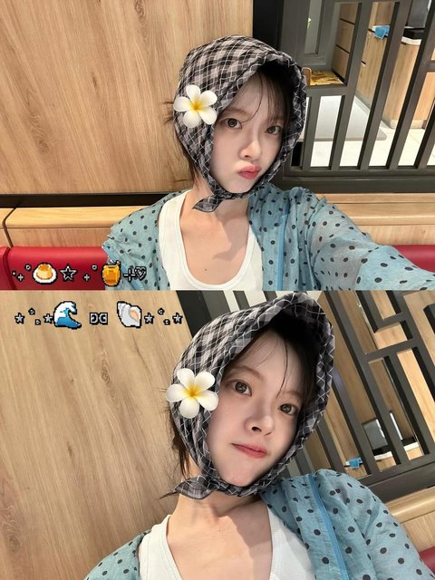 한수아가 직접 공개한 이번 사진은 실내의 나무 질감 벽 앞에서 촬영됐다. 가벼운 민트색 도트 무늬 셔츠와 흰 티셔츠를 겹쳐 입은 그는 복고적인 체크 보넷을 머리에 얹고, 귀 옆에 하얀 프리지어 같은 꽃장식을 살포시 꽂았다. 때론 입술을 가볍게 내밀며, 또 다른 컷에서는 수줍듯 입꼬리를 올리고 카메라를 응시했다. 볼에 드리운 연한 그림자와 환한 얼굴빛이, 한수아만의 부드럽고 따뜻한 분위기를 배가시켰다. 늦더위가 채 식지 않은 10월 초의 실내, 사적인 공간의 포근함이 사진 전체에 스며든다.