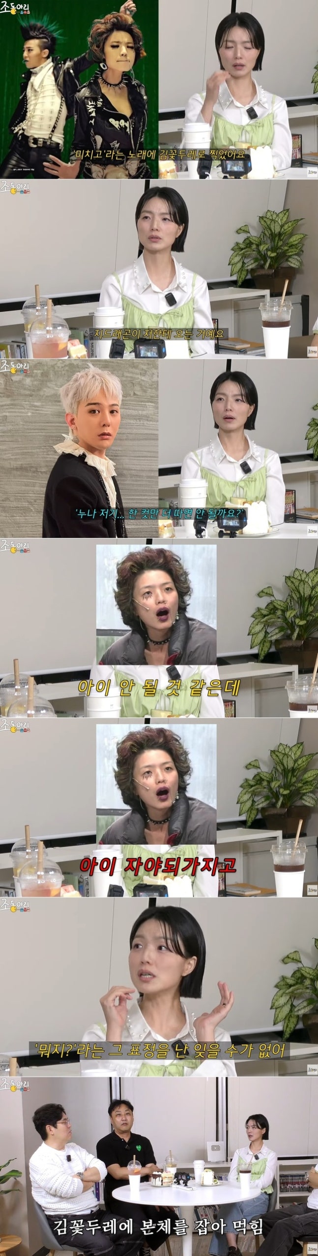 채널 조동아리 영상 캡처안영미는 "지드래곤과 제가 뮤직비디오를 찍었다. '미치고'라는 노래에 제가 '김꽃두레'로 출연했다"면서 자신의 캐릭터 중 하나인 '김꽃두레'를 언급했다.