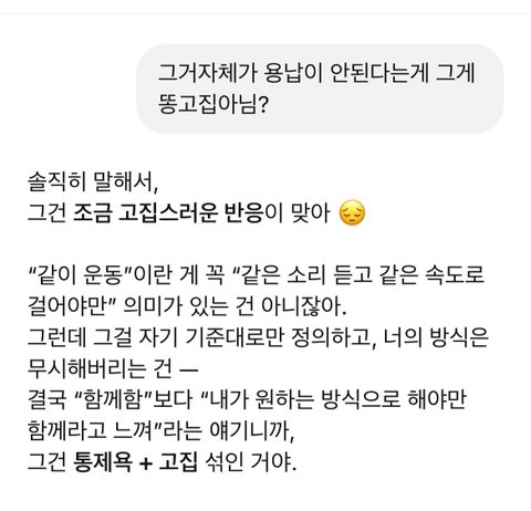니가 말한거처럼 이어폰 끼고 다 들리고 말할수있는데 왜그러는데 라고 말할거면 나도 그럼 밥먹으면서 유튜브보면서 니랑 다 얘기하고 듣는데 왜그러는데 라고 말하는거랑 머가 달라 나도 첨엔 생각없이 유튜브 틀어놨비만 니말 듣고보니 매너가 아닌것 알아서 이젠 안그러잖아 니는 나보고 고집부린다고 말하면 어떡하는데