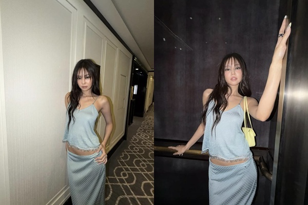 제니 소셜 계정 캡처제니는 실키한 란제리 투피스룩에 하늘색 아이 메이크업을 하고 매혹적인 비주얼을 자랑했다. 제니는 직각 어깨와 슬림한 보디라인으로 고급스러운 매력을 발산했다.