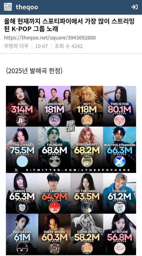 트와이스 스트래티지가 작년 12월 발매곡이라 그렇지 그 곡도 집계됐으면 2억스밍정도 됐을거임(피쳐링이랑 없는 버전 합산해서 근데 스포티는 원래 합산해줌) 지금 트와이스 해외에선 제3의 전성기 수준으로 잘나감