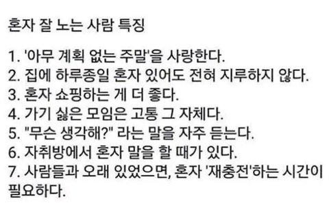 자취방 혼잣말.. 내가 그럼 ㅠㅠㅠ 나는 사람한테 상처 받아서 더 이상 상처 받기 혼자 노는데 이젠 적응되서 ㅋㅋㅋㅋㅋ 혼자가 편함...