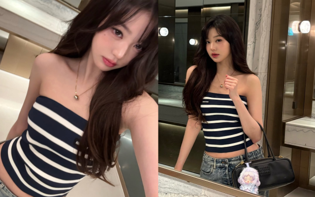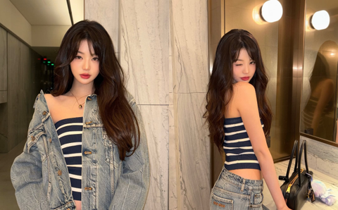 장원영 인스타그램공개된 사진 속 장원영은 프랑스 파리행을 앞둔 공항 대기실에서 여유로운 시간을 보내고 있다. 스트라이프 패턴의 튜브톱과 데님 팬츠를 매치한 그는 군살 하나 없는 허리 라인과 매끄러운 어깨선을 드러내며 세련된 분위기를 자아냈다. 골드 롱 네크리스로 포인트를 더해 고급스러운 감각까지 놓치지 않았다.