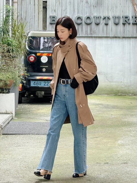 베이지색 트렌치코트가 주는 절제된 포근함과 함께, 검은 이너와 간결한 데님 팬츠가 세련된 무드를 배가시켰다. 곧게 뻗은 단발머리는 얼굴선을 감싸며 전체 분위기를 정돈했고, 커다란 블랙 토트백을 무심하게 멘 모습에서 일상 속 자신감이 엿보였다. 간결한 블랙 벨트와 투톤 펌프스가 전체 패션의 완성도를 더했으며, 잔잔하게 내린 가을빛과 어울려 세련된 도심의 정취를 오롯이 자아냈다.