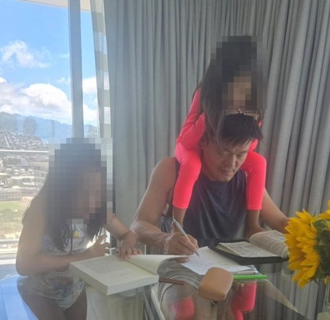 사진 속 박진영은 둘째딸을 목말 태운 채 책을 읽는 첫째 딸 옆 성경 필사를 하고 있다.