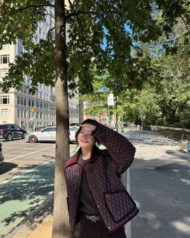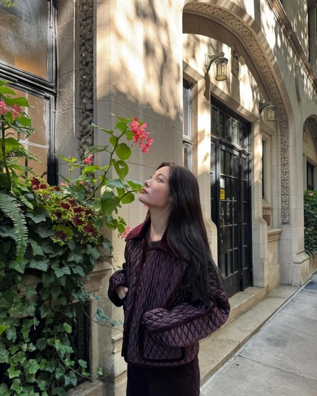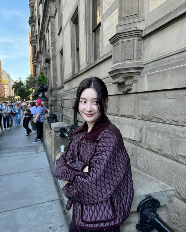 공개된 사진 속 정채연은 버건디 컬러의 퀼팅 재킷을 착용하고, 고급스러운 배우 무드와 함께 포즈를 취하고 있다.