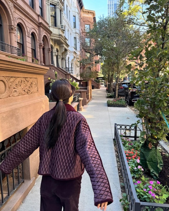 버건디빛 퀼팅 재킷과 코듀로이 팬츠로 톤온톤 스타일링을 완성하며, 고급스럽고 따뜻한 가을 무드를 자아낸다.