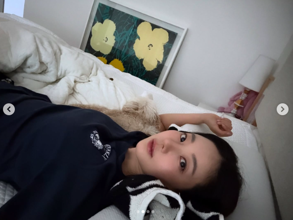 사진 속 김사랑은 침대에 누워 반려견과 함께 여유로운 일상을 보내고 있는 모습이 담겼다. 셀카를 찍은 그는 누워있는 자세에도 불구하고 변함없는 미모를 과시하고 있다.