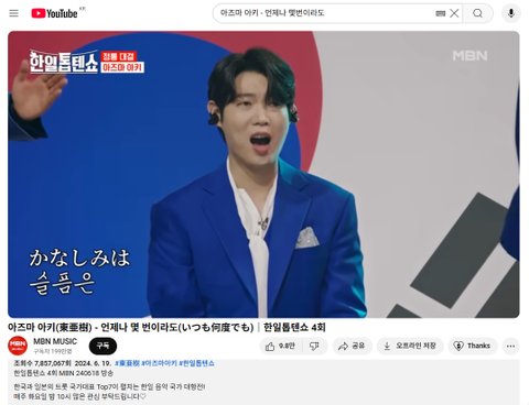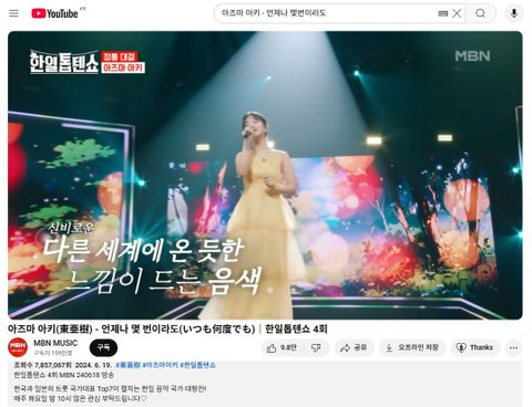 (사진3·4 설명) 아즈마 아키(東亜樹) - 언제나 몇번이라도(いつも何度でも)|한일톱텐쇼 4회