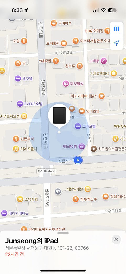밑에 사진처럼 22시간전 아이패드의 마지막 위치만 뜰 뿐, 그 이후에는 위치 업데이트가 안되고 있기에 도둑이 전원을 끄고 다른곳으로 향한건지, 아니면 실제 위치 주변 거주지에 있는지도 알 방법이 없는 상황입니다. 이런 상황에서 제가 할수 있는게 뭔지 여쭤보고, 저와 비슷한 도난사건을 겪으신 분들께 도움을 구해보고자 이렇게 긴 글을 쓰게 되었습니다. 감사합니다.