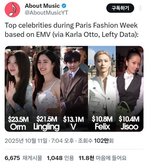 Lefty 기반으로한 EMV(Earned Media Value) 수치임 패윜 끝나면 나와 소셜미디어 콘텐츠의 영향력을 분석해서 비용으로 환산한 값으로, 업계 영향력을 표현하는 수치래