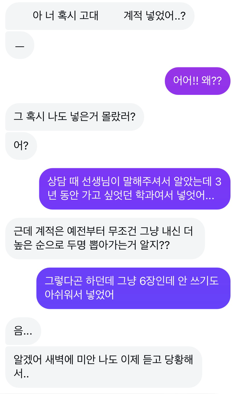 그냥 나도 쭉 그 학과 생기부로 썼고 달리 넣을 데도 없으니까 넣엇지 걔 배려해서 넣어야 하나ㅜㅜ 어차피 자기가 붙을 거 알면서 굳이 왜 견제하는 거지
