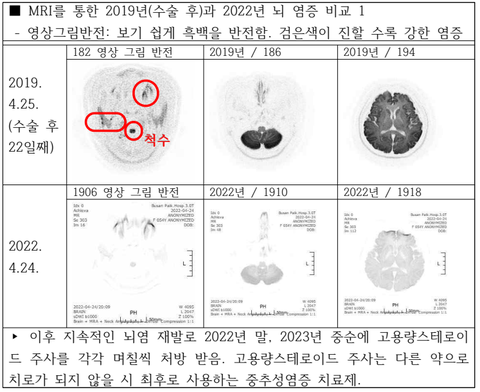 수술 즉시 제게 뇌염과 척수염이 심각하게 발생했고 뇌가 전반적으로 위축되었으며, 특히 뇌염이 심각했던 양쪽 소뇌 반구, 좌두정엽, 우측 두정엽 및 측두엽에서 대사저하 (뇌기능 저하 -> 뇌전증, 알츠하이머)(뇌 PET-CT, 2022.9.19.)를 확인할 수 있었으며, 척수염 및 척수병증, 뇌위축과 뇌의 명시된 기능장애를 진단 받았고 이것으로 저는 2025년에야 비로소 매우 어렵게 사지 마비로 인한 중증장애 판정을 받았습니다.