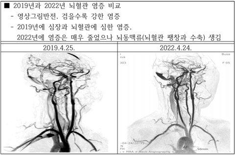 - 2022년 뇌동맥류 진단 (뇌 MRA 찍을 때마다 뇌혈관의 팽창, 수축 위치 다름. 혈관 감염 및 뇌손상으로 인한 혈관 경련이 원인)