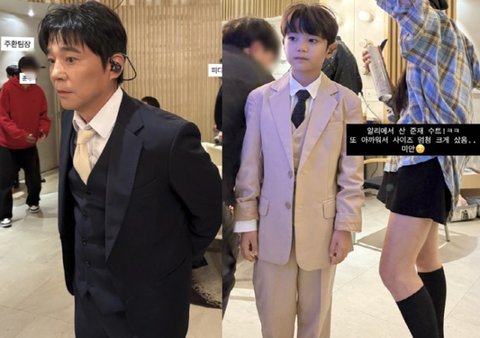 사진 속에는 스타일링을 받고 있는 임창정의 넷째 아들 준재 군의 모습이 담겨있다. 이때 귀에는 인이어를 낀 채 다소 긴장한 듯한 준재 군의 표정이 귀여움 가득했다. 해당 모습은 무대에 오르기 전 준비 중인 임창정과 똑 닮아있어 시선을 끈다. 특히 이 과정에서 수트에 넥타이까지 착용한 준재 군은 큰 눈망울에 또렷한 이목구비 등 훈훈한 비주얼을 자랑하고 있어 감탄을 자아낸다.