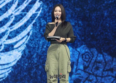 신아영 아나운서가 13일 오후 서울 광진구 예스24 라이브홀에서 열린 그룹 투어스(TWS) 미니 4집 ‘play hard(플레이 하드)’ 쇼케이스에서 멤버를 소개하고 있다.